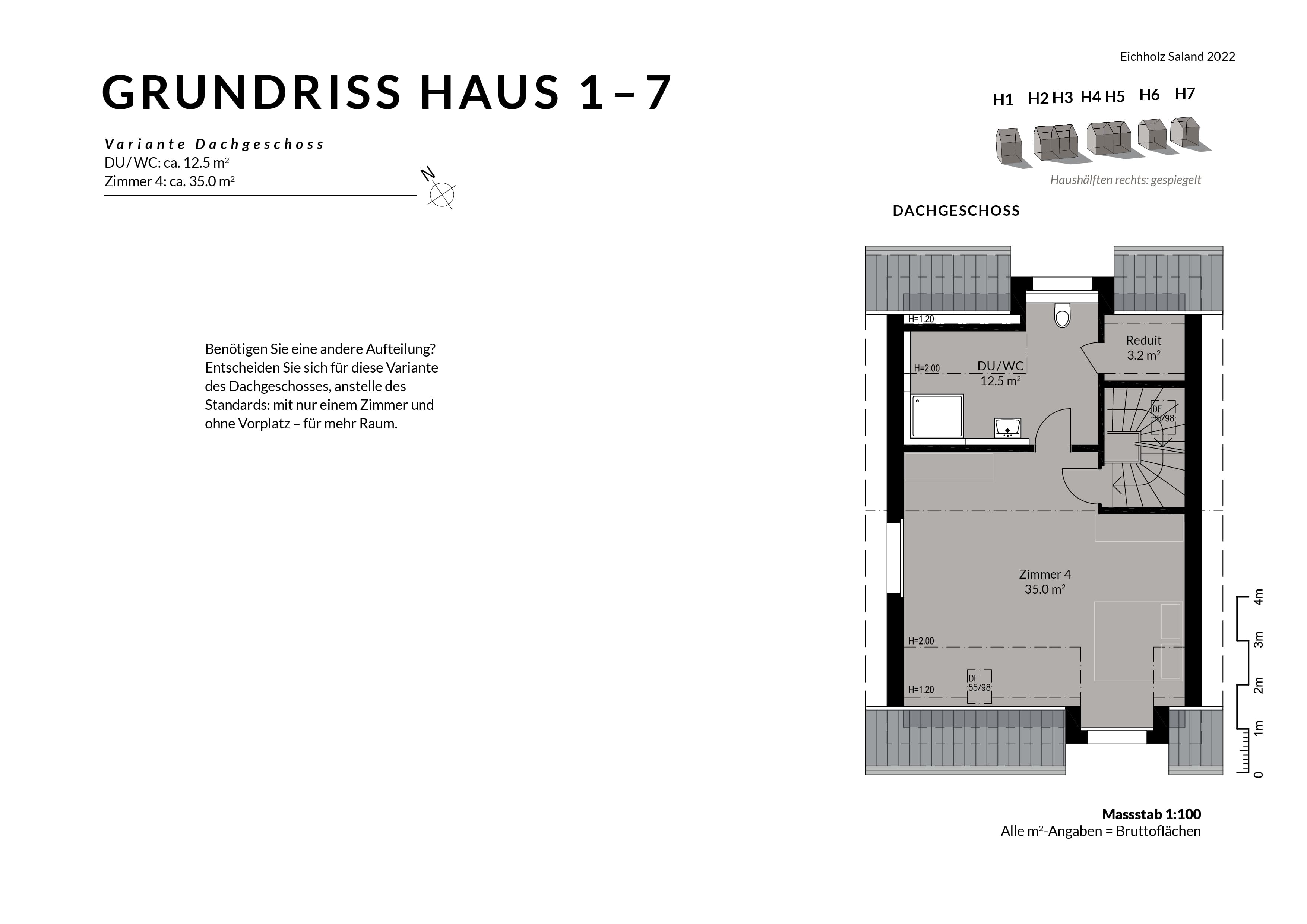 Entscheiden Sie sich für diese Variante des Dachgeschosses, anstelle des Stan­dards: mit nur einem Zimmer und ohne Vorplatz – für mehr Raum.